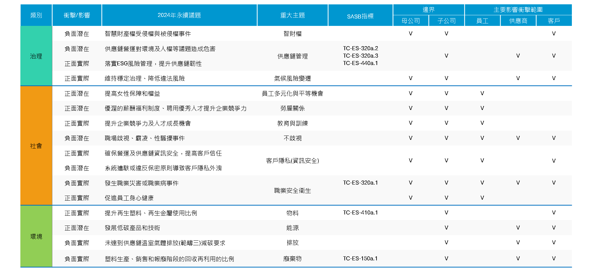 神基控股每年透過與利害關係人的溝通或議合,蒐集重大性議題,並經由鑑別程序辨識當年度永續重大議題對營運、財務以及利害關係人所造成的衝擊或影響,據此擬訂公司永續發展計畫和目標。2024年本公司共計篩選出17個永續議題,對應12個GRI主題,1個自訂主題,相較2023年,2024年新增勞雇關係,依循PDCA管理循環提出各個主題的因應對策,除了降低負面衝擊,亦強化正面潛在影響性議題的積極作為,呼應利害關係人的期待,為公司帶來更多正向能量。